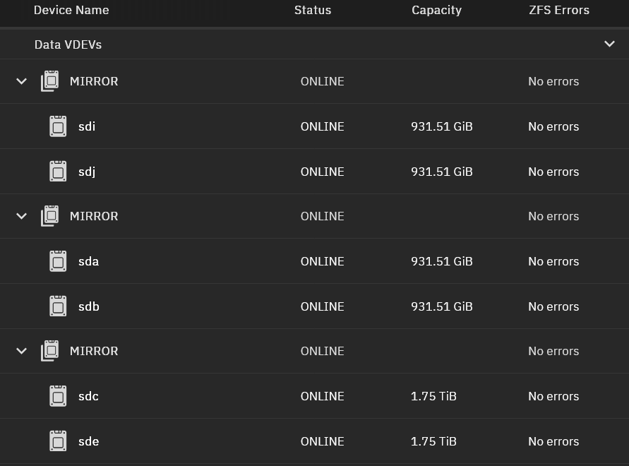 this example uses two pairs of mirrored SSDs – technically two Vdevs – joined in a Pool. Yes too many acronyms! A big file read test uncached is about 1.6 GB/s showing how fast this design is! One thing that’s nice about TrueNAS scale is you get the simple web setup but its just a debian server if you log into it. Whats is less fun is how complex the possible storage setup is. Next test was unplug one of these drives and see what the recovery process is – and it worked – plugging similar drive in and clicking to rebuild.